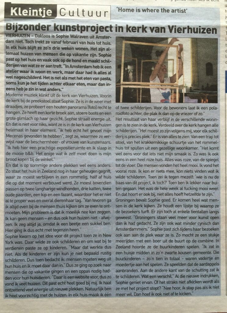 1/8-11/8 Vierhuizen In het noorden van Groningen, in Vierhuizen, woont een hele aardige mevrouw die mijn werk en schildertour met interesse volgt. Ze bestiert een groot akkerbouw bedrijf, heeft een bed en breakfast voor tien gasten en zet zich in voor de kerk in het dorp. Zij heeft me gevraagd te exposeren in die kerk,…
