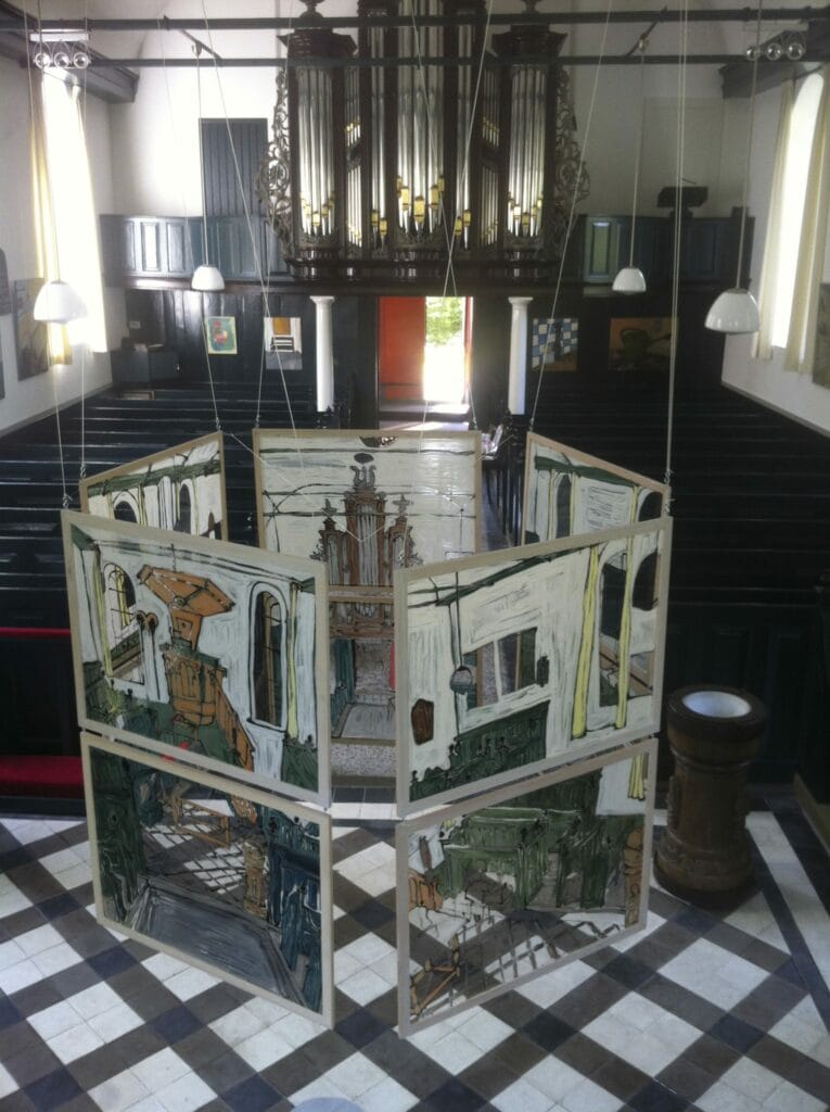 This installation is a panorama of the church painted with oil on 10 windows 50×70 cm of perspex, framed in wood and hung circulair so you can stand in the middle and see the church twice, once through your own eyes and once through mine. Inception.