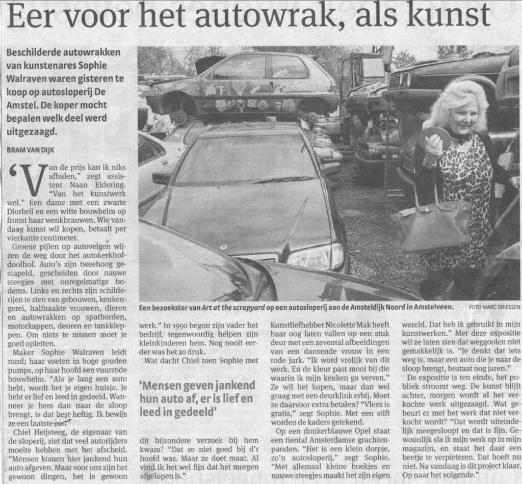 In de zomer van 2011 heb ik een expositie gemaakt op de autosloop tussen Ouderkerk aan de Amstel en Amsterdam. Maandenlang elke dag van 7:30 tot 18:00 beschilderde ik sloopauto’s die opgestapeld stonden te wachten om ze samen op slechts één dag te tonen aan het publiek.