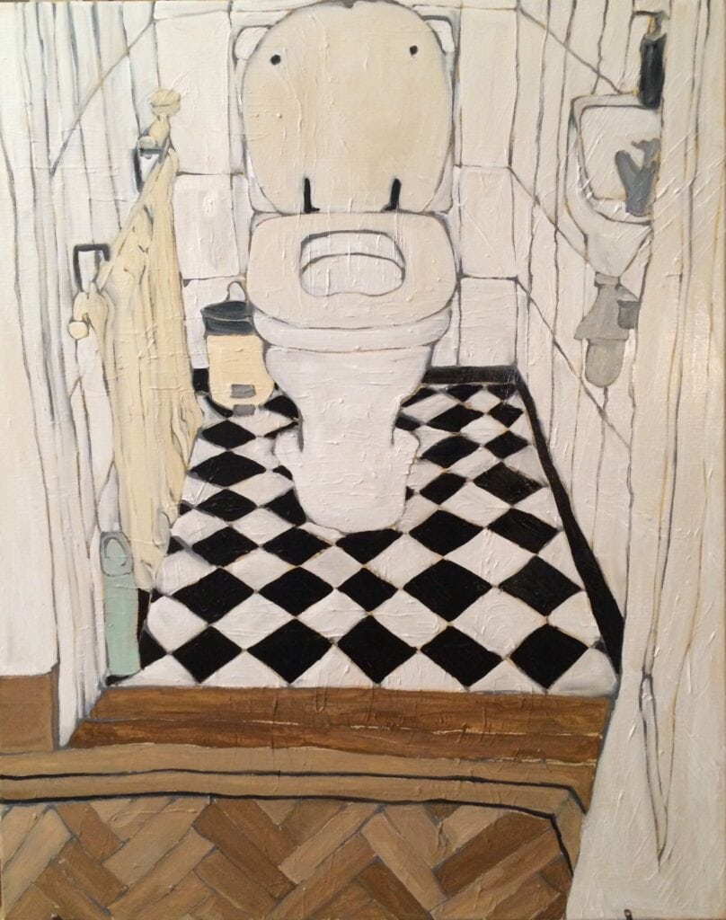 Study WC, ink on paper, 52x36cm. WC Hilversum, oil on linnen, 100×80 cm, SOLD. Speeldoos, Acrylic and ink on paper, 36×52 cm. -