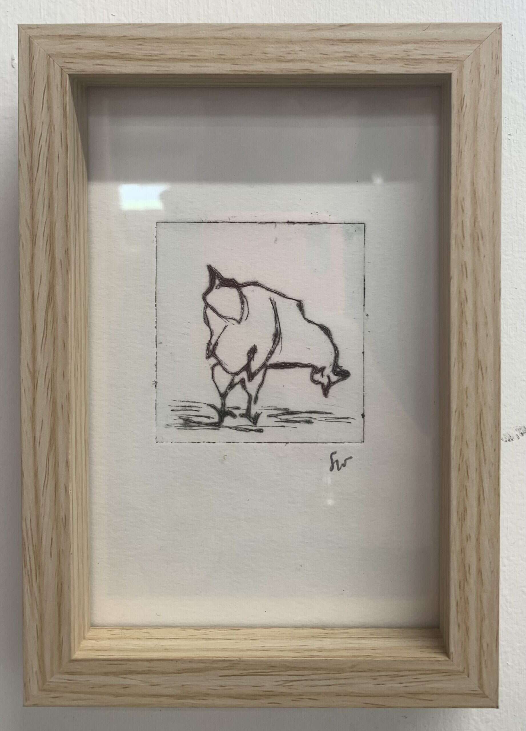 Piepklein etsje van een kip, 6x 5,5cm in een lijstje van 17x 12cm.