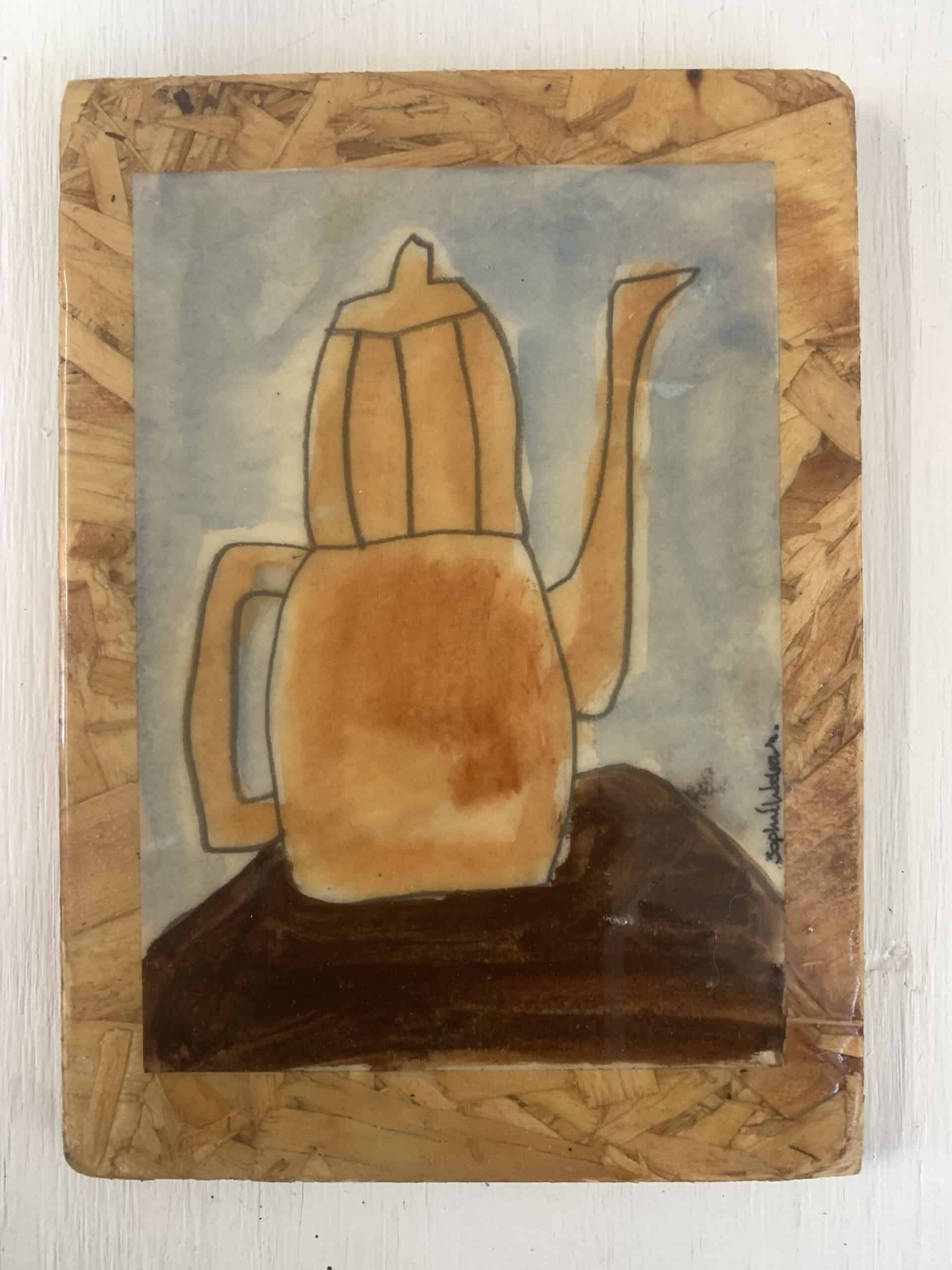 Houten plankje van 18 bij 13 cm met daarop een tekening in oliepastel onder een dikke laag glanzende epoxy-hars.