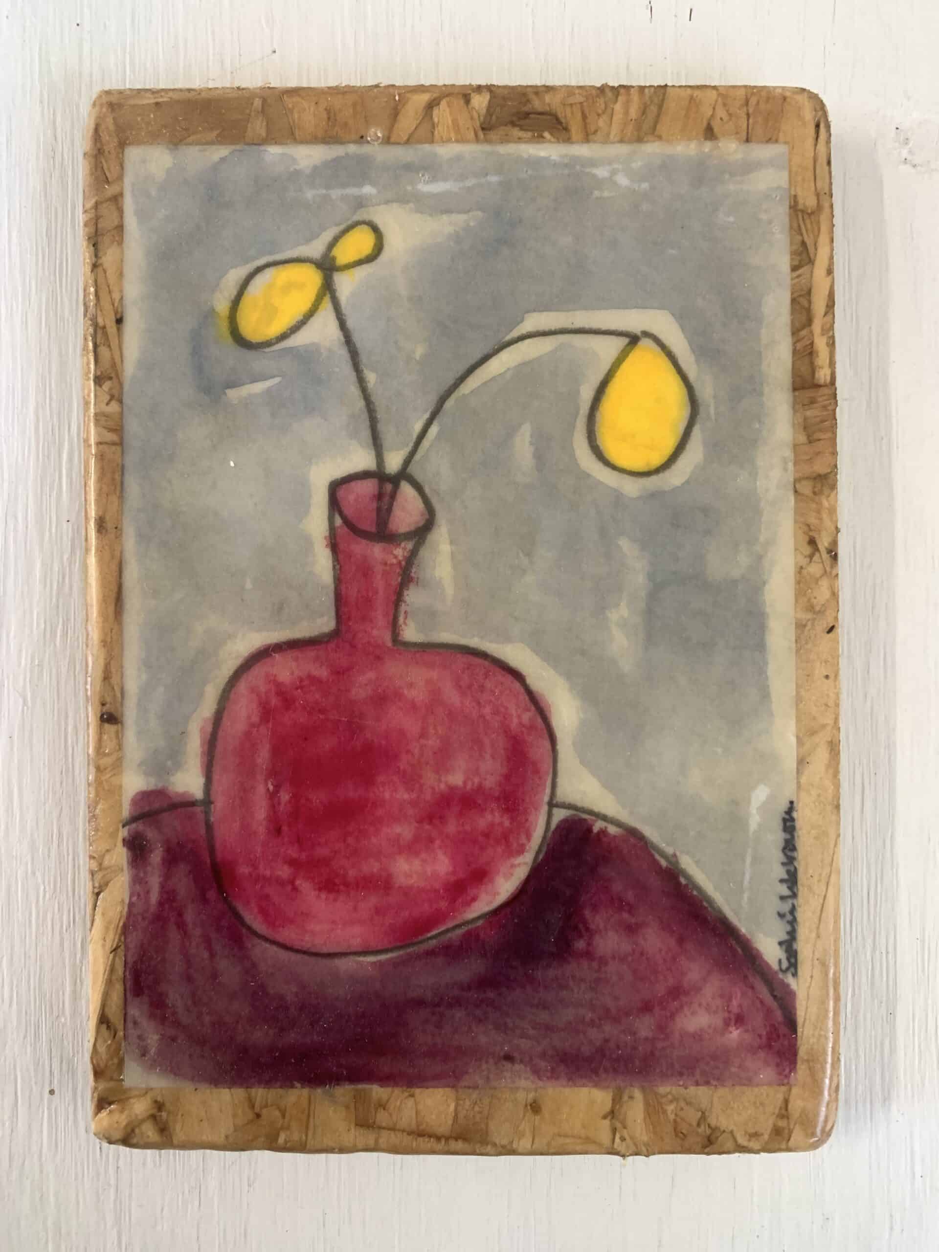 Houten plankje van 17 bij 12 cm met daarop een tekening in oliepastel onder een dikke laag glanzende epoxy-hars.
