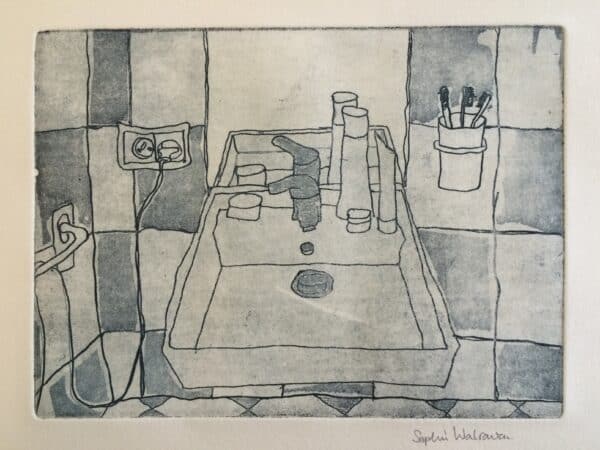 Stilleven van de wastafel in La Redonne, met blauw op wit etspapier.